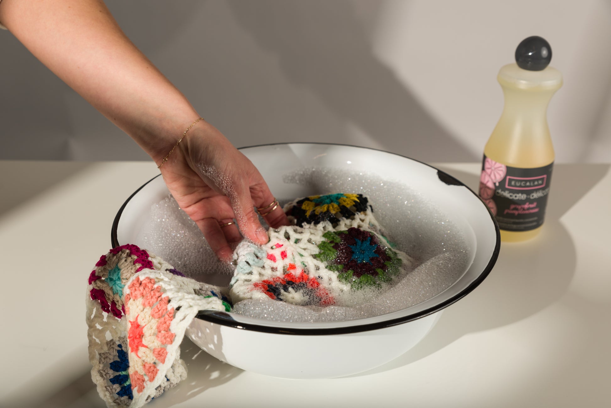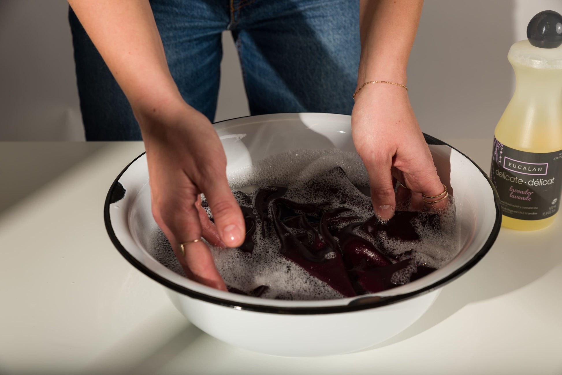 Eucalan is a no-rinse wash, meaning that the formula delicately releases dirt into the wash basin, cleaning fabric without the need of a final rinse through. Though the fabric absorbs a little of the soap, it has beneficial properties. Lanolin fortifies & conditions clothing fibres - particularly great for woolens & knits, but can be used on most anything.